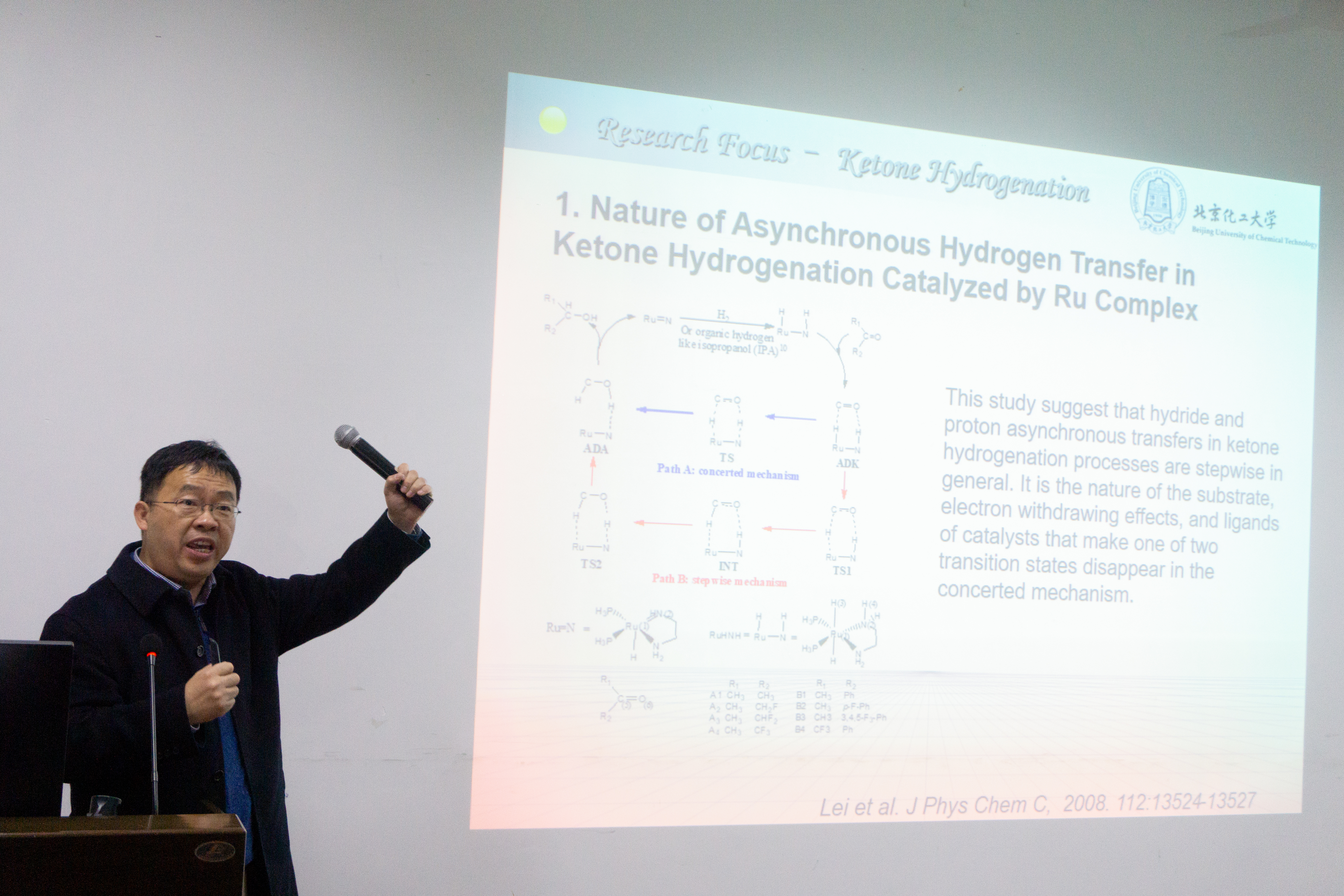 讲座开始,雷鸣教授从什么是催化反应说起,介绍了催化反应中的活化能以及催化剂的性能和利用。紧接着,他详细阐述了在加氢和脱氢两大催化理论上的研究及成果:钌铬合物催化酮加氢的非同步氢转移性质,二氢源对过渡金属配合物催化酮加氢反应,胺催化理论以及甲醇脱氢机制。其中,雷鸣教授在DFT研究上,就氢气还是醇类作为氢能源催化的问题进行详细说明,并对甲醇脱氢过程进行了深入的数据分析和研究讨论。