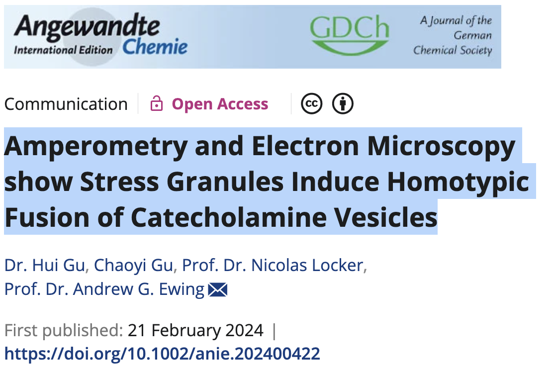 近日,公司太阳成集团tyc234cc教师谷慧副教授发现应激颗粒可促进同型囊泡融合。该研究成果以“Amperometry and Electron Microscopy show Stress Granules Induce Homotypic Fusion of Catecholamine Vesicles”为题发表在国际顶级期刊《Angew. Chem. Int. Ed.》上,该期刊为化学领域的经典Top期刊(影响因子:16.6)。该研究工作主要由谷慧副教授(第一作者)和哥德堡大学合作导师Andrew Ewing(通讯作者)共同完成,太阳成集团tyc234cc为第一单位。