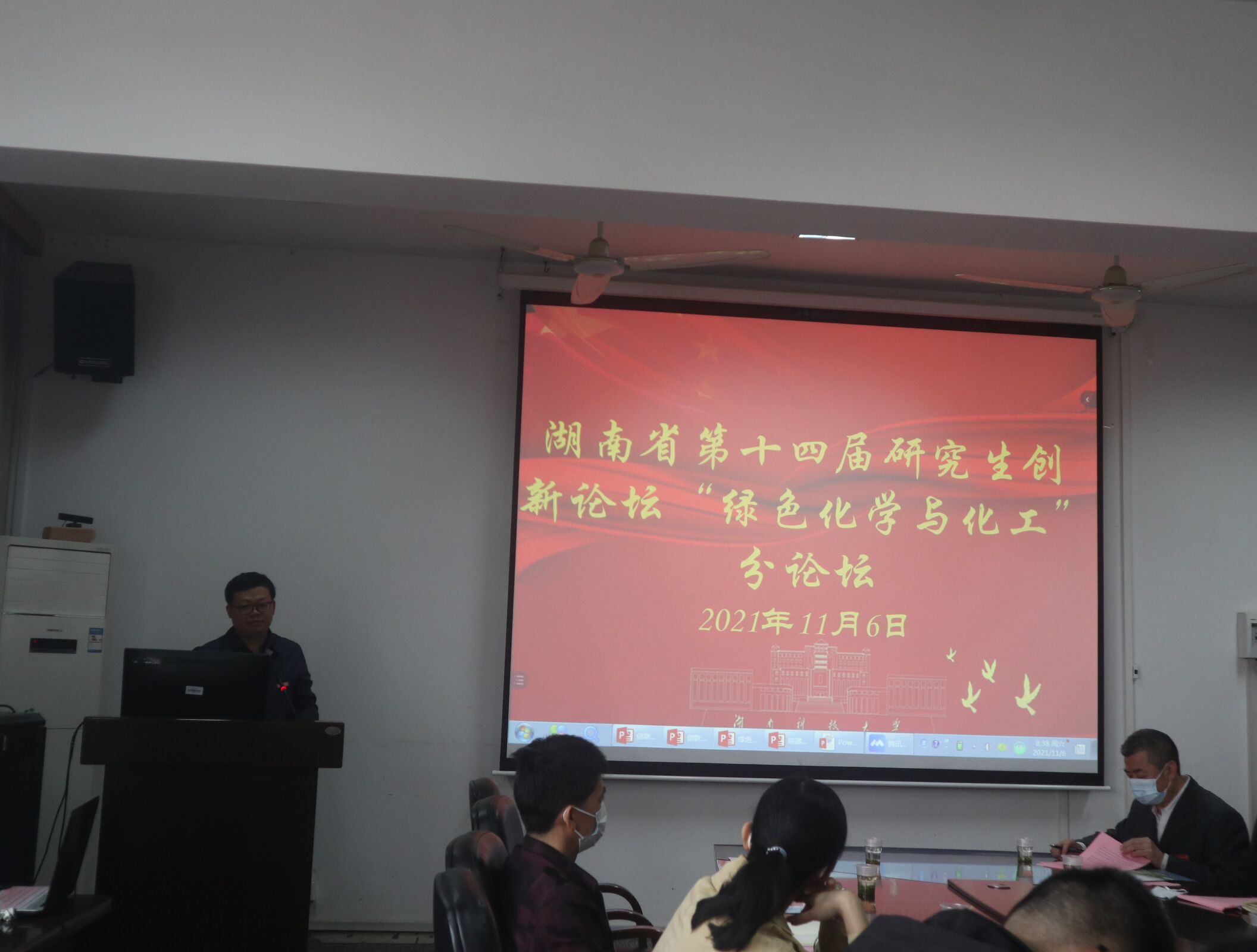 简短的开幕式后,论坛报告会正式开始。来自湖南师范大学贺慧婷等七位研究生依次对自己的研究进行报告。他们分别围绕绿色化学的主题对自己的研究进行讲解和答辩。针对他们的研究内容,评委老师们进行了现场提问,指明了进一步研究的路径和策略,现场学术氛围浓厚。