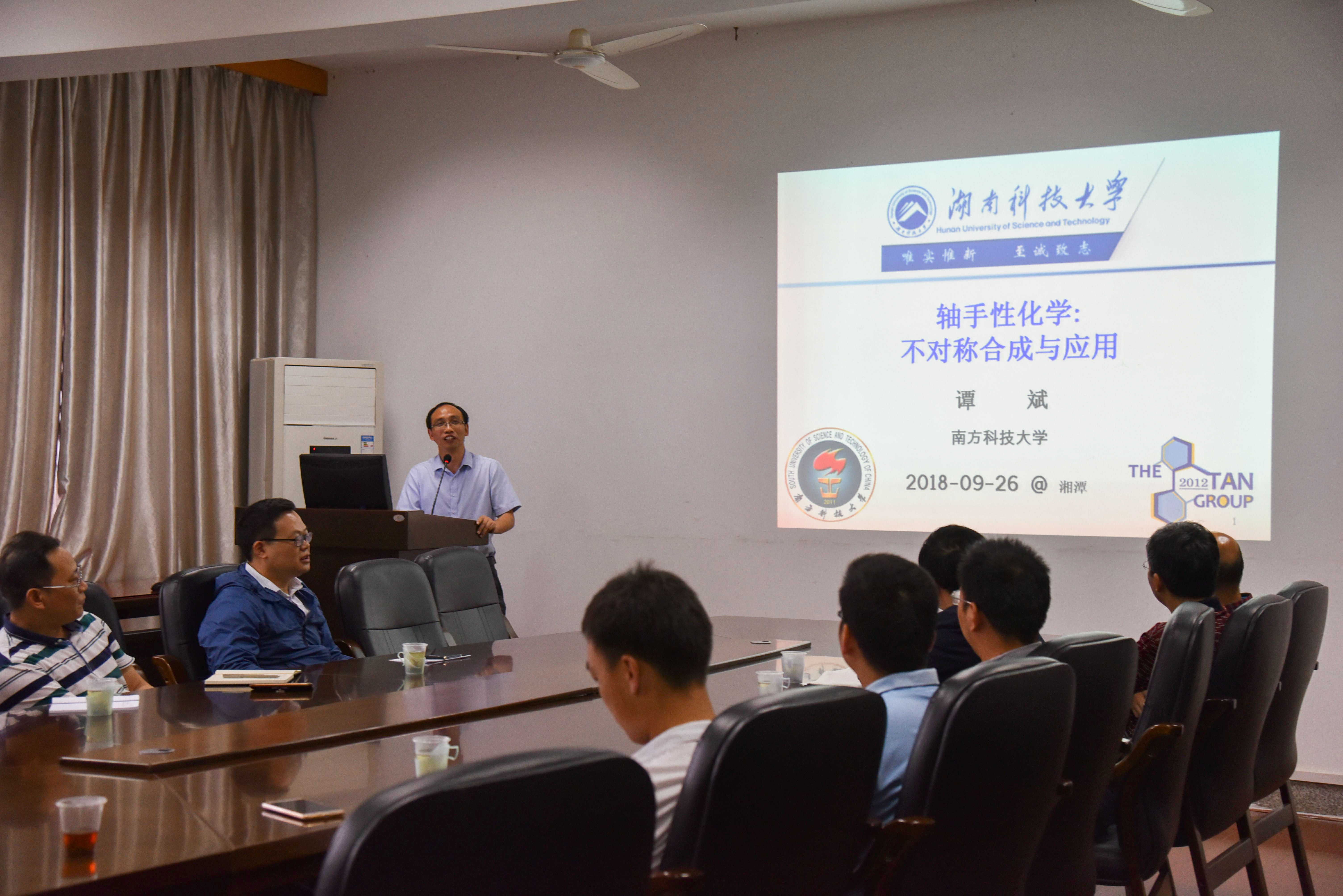 2018年9月26日下午,应太阳成集团tyc234cc和理论有机化学与功能分子教育部重点实验室的邀请,国家杰出青年基金获得者谭斌教授在化工楼三楼学术报告厅以“轴手性化学:不对称合成与应用”为主题,做了一场精彩的学术报告。太阳成集团tyc234cc师生、理论有机化学与功能分子教育部重点实验室科研人员等到场聆听。此次报告会由公司周虎书记主持。