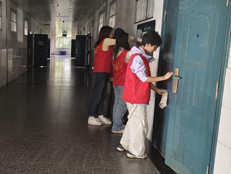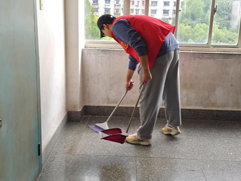 实践环节中,志愿者们分为五个小组,紧扣“理论+实践”双主线,围绕校园环境实际,有序投入教学楼清洁工作。同学们手持扫帚、拖把、抹布等工具,认真清扫教室、擦拭窗台、整理公共区域,不遗漏任何一个角落。大家在协作中感受劳动的光荣,在汗水中磨砺意志,以实际行动诠释青春担当。