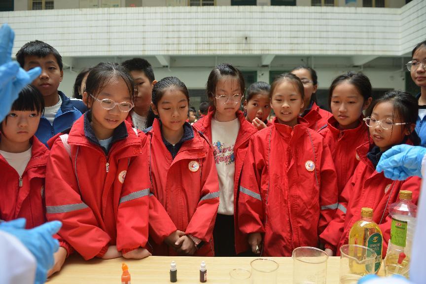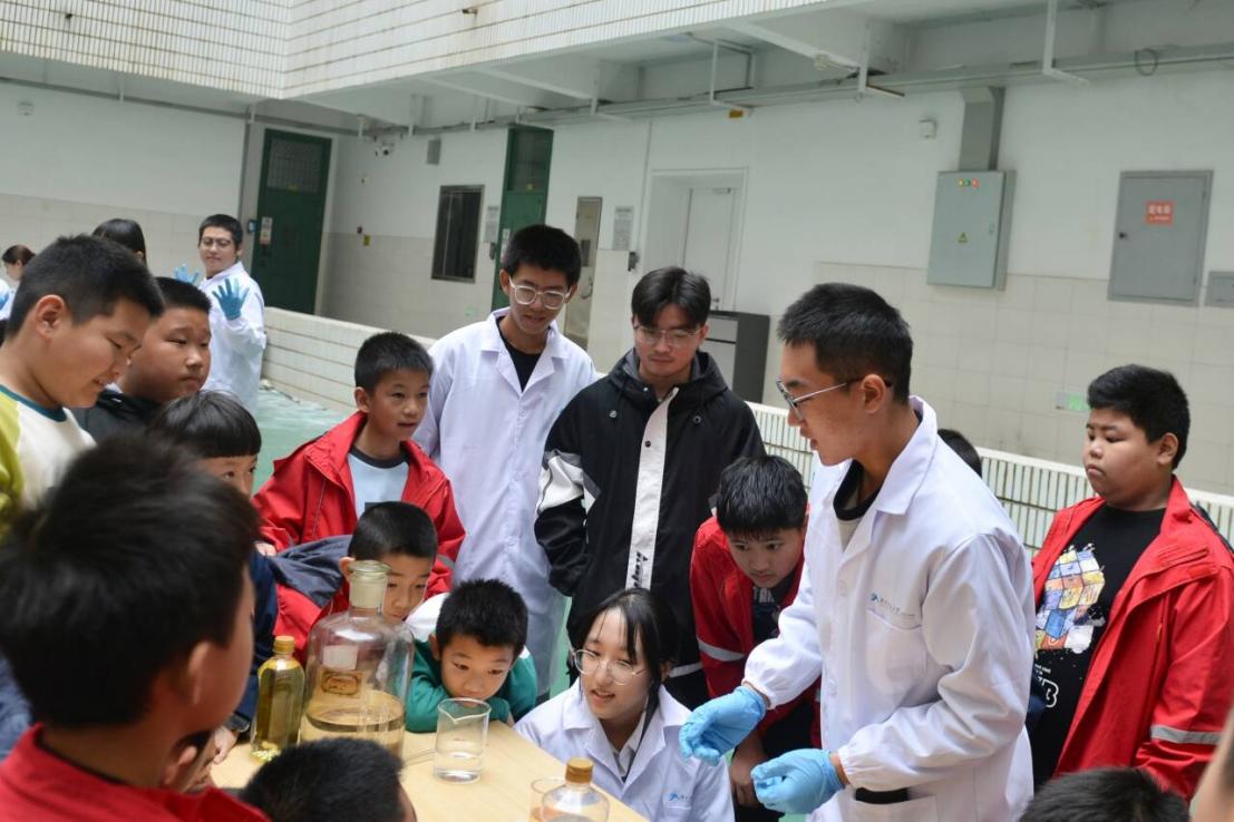 当试剂瓶中液体瞬间绽放斑斓色彩,当自制的“熔岩灯”翻腾起梦幻光影……一双双充满好奇的眼睛,点亮了太阳成集团tyc234cc的实验室。10月26日下午,一场以“立德树人、科教融合”为主题的科学教育实践活动在这里生动开展,平江县第一学区200余名中小学师生走进大公司园,在化学的奇幻世界中沉浸式体验科学的魅力。
