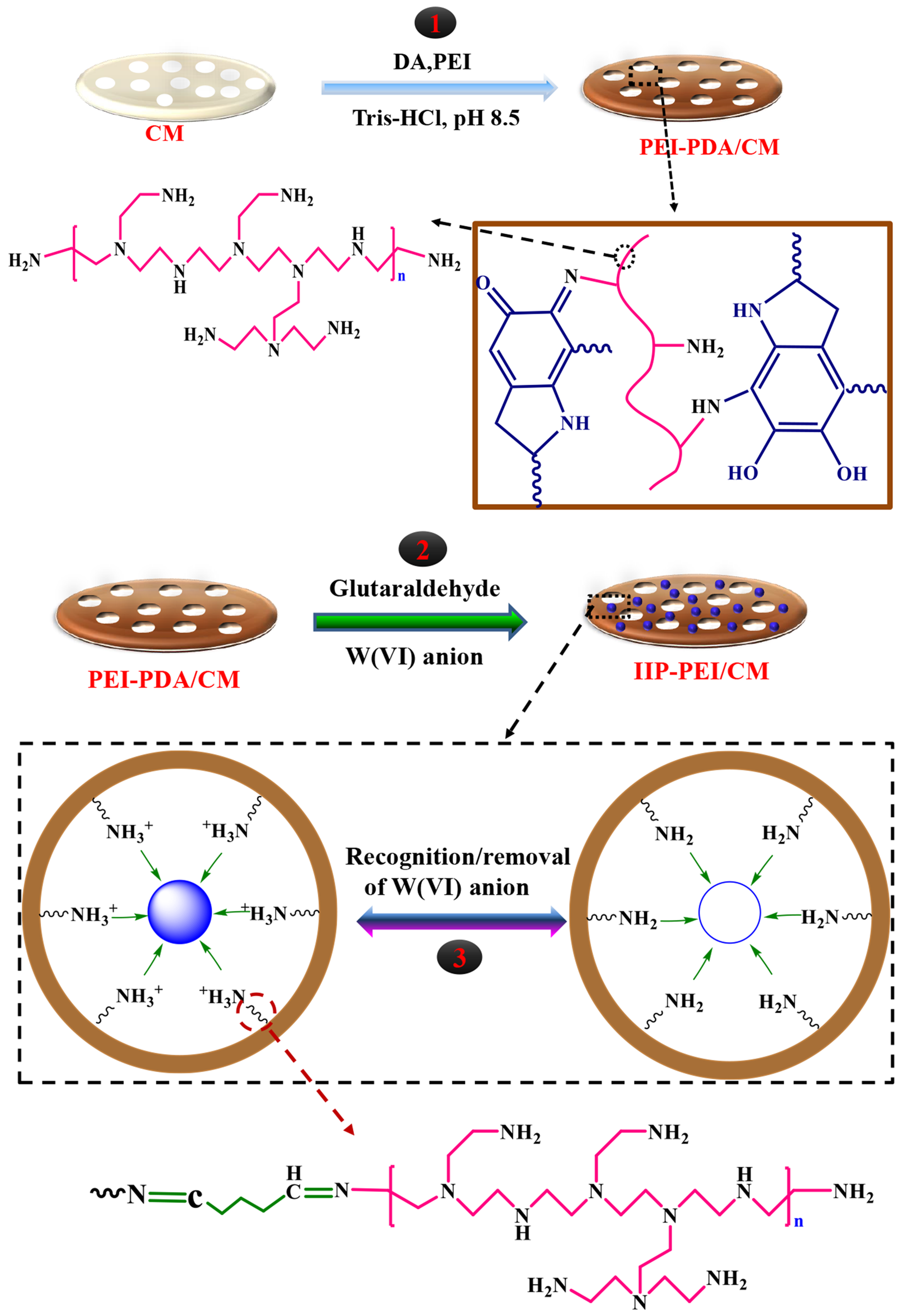 近期,太阳成集团tyc234cc曾坚贤教授课题组报道了采用三氧化二铝陶瓷膜为载体,以W(VI)或Mo(VI)为模板离子,多巴胺/聚乙烯亚胺共沉积或1-乙烯基咪唑为功能单体,戊二醛或1,6-二溴己烷为交联剂,CuSO4/H2O2为催化剂,采用表面印迹和接枝聚合方法,成功制备了能选择性分离W(VI)或Mo(VI)的新型印迹陶瓷膜。该印迹陶瓷膜对W(VI)或Mo(VI)具有较大的吸附容量,较高的选择性分离系数,较快的吸附动力学,且再生和循环使用性能良好。该工作探索了印迹聚合物高效选择性和陶瓷膜优异分离性能的结合行为,为复合陶瓷膜选择性分离金属离子提供了新思路。