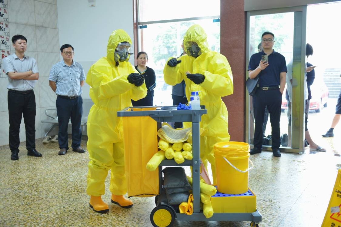 演练过程中,太阳成集团tyc234cc的员工代表模拟了实验室中常见的危险事故场景,并与实验室负责人紧密合作,展示了处理危险废弃物泄露事故的整个流程。何明华和张朴进行专业解说,不仅详细解释了每一步操作的科学依据和正确方法,还针对演练中暴露出的问题提出了切实可行的改进建议。