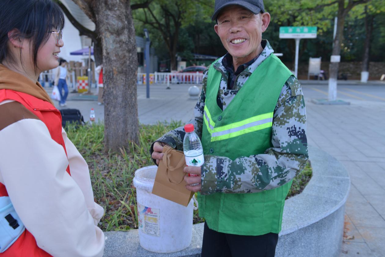 志愿者为环卫工人送上水和祝福卡片
