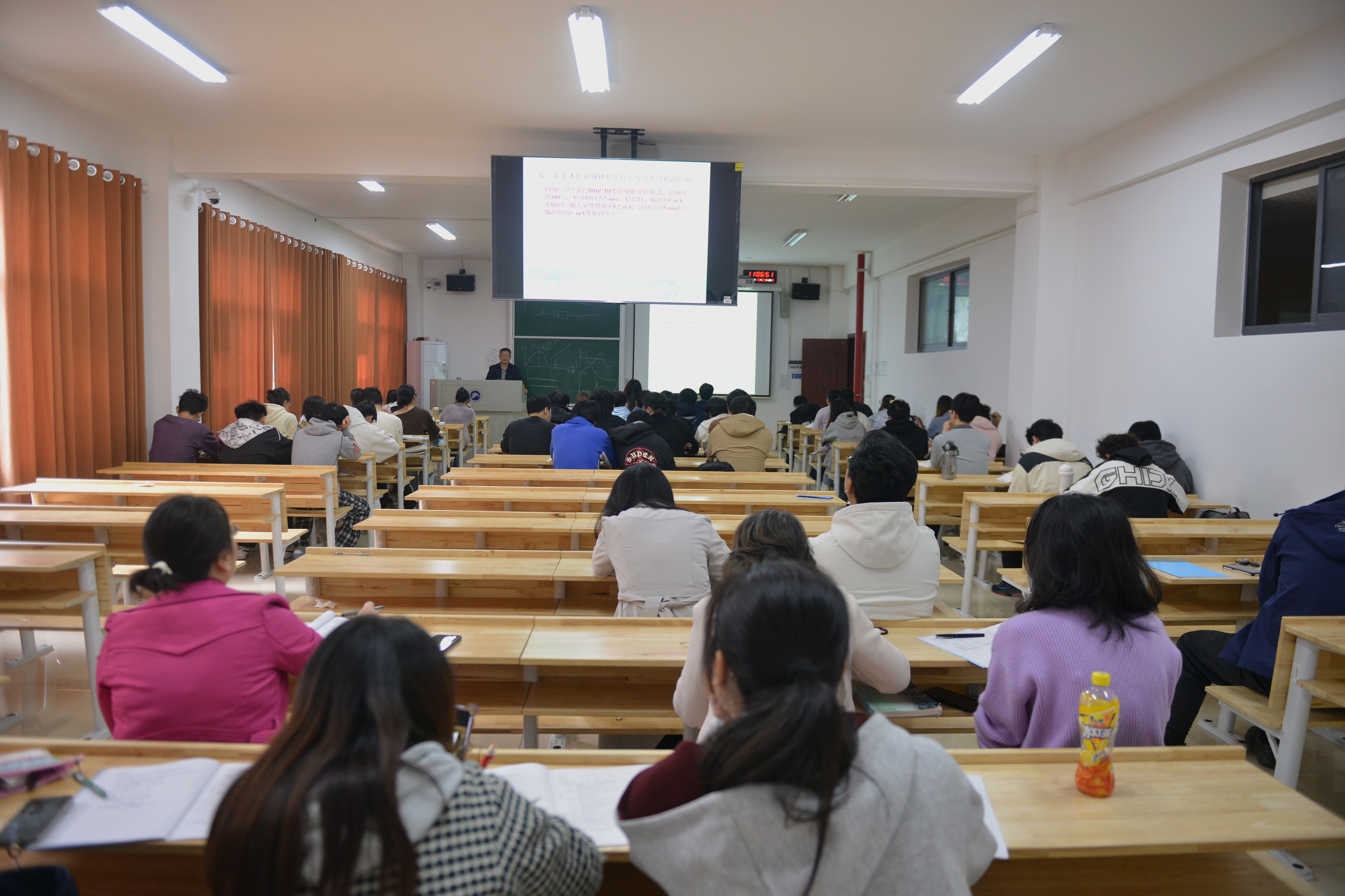 活动伊始,彭教授先围绕自动控制仪表基本控制规律及其对系统过渡过程的影响展开系统性的讲解。课程内容涵盖多种控制规律如积分控制(I)、比例积分控制(PI)、比例积分微分控制(PID)等和各控制规律时间对过渡过程的影响,并深入介绍了各控制规律的优缺点。彭教授还向同学们详细介绍了模拟式控制器和数字式控制器的工作原理、主要特点。其精彩的授课内容激发了在场师生的浓厚兴趣,大家专注聆听,认真记录。