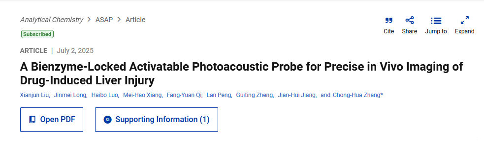 近日,公司教师刘贤军副研究员,张崇华副教授开发了一种新型双酶型可激活式光声探针用于药物性肝损伤的精准活体成像。该研究成果以“A Bienzyme-Locked Activatable Photoacoustic Probe for Precise In Vivo Imaging of Drug-Induced Liver Injury”为题发表在国际顶级期刊《Analytical Chemistry》上,该期刊为分析化学领域的经典Top期刊。该研究工作主要由刘贤军博士(第一作者)和张崇华副教授(通讯作者)共同完成,太阳成集团tyc234cc为第一单位。