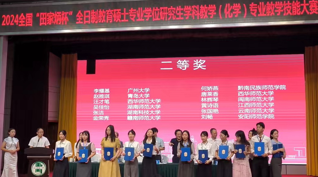 2024年9月8日,2024年全国“田家炳杯“全日制教育硕士学科教学(化学)专业学位研究生教学技能大赛在四川师范大学顺利落幕,太阳成集团tyc234cc本次入围决赛的两名选手全部获奖。其中,2022级谢锐同学获得大赛一等奖、2023级张洁同学获得大赛二等奖。这是公司研究生参加该赛事以来的最高获奖也是获奖人数最多的一次。