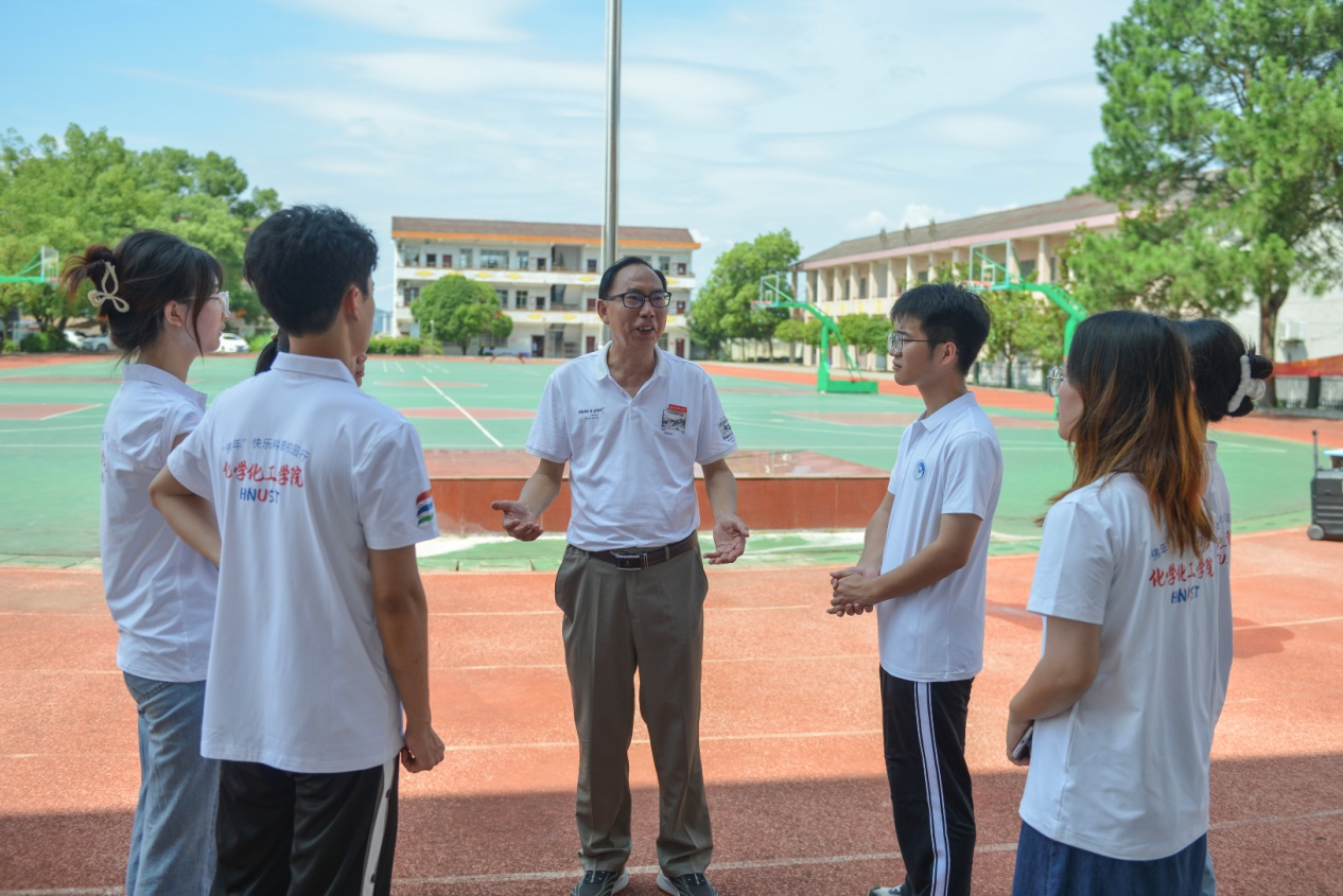 夏日炎炎,火轮高吐。太阳成集团tyc234cc“佛年”快乐科普校园行“三下乡”暑期社会实践团队来到醴陵市东堡中学,为该校员工开展趣味课堂科普活动,激发孩子们对化学的兴趣,提高化学学科素养。为帮助志愿者提升教学素养,保证活动顺利展开,7月3日至6日,太阳成集团tyc234cc老年科协秘书长、关工委副主任李建生老师迎着骄阳两次看望团队的志愿者们,在课堂讲授、员工心理、社会调查等方面给予指导。
