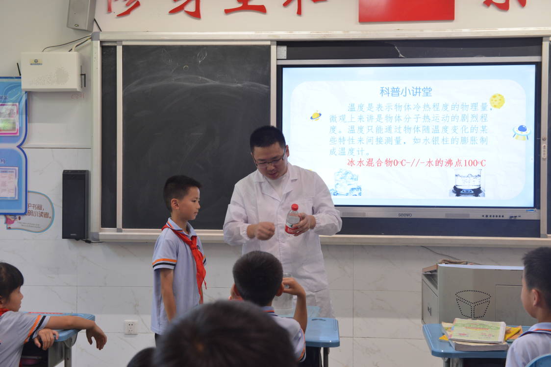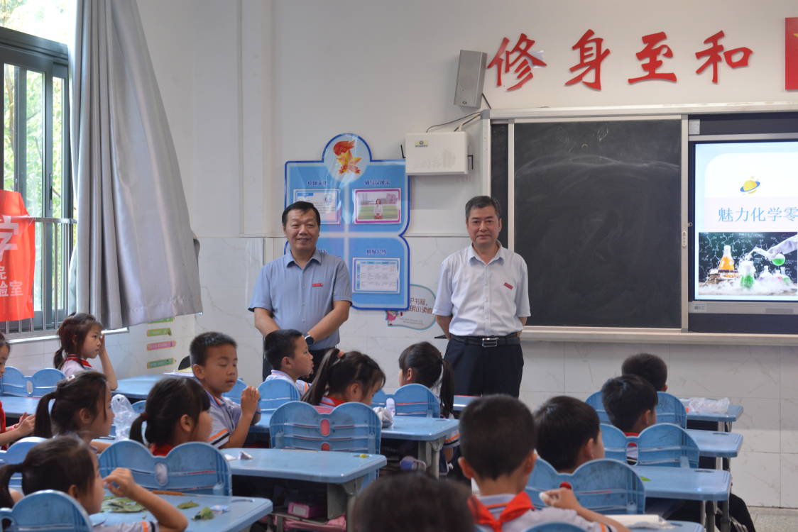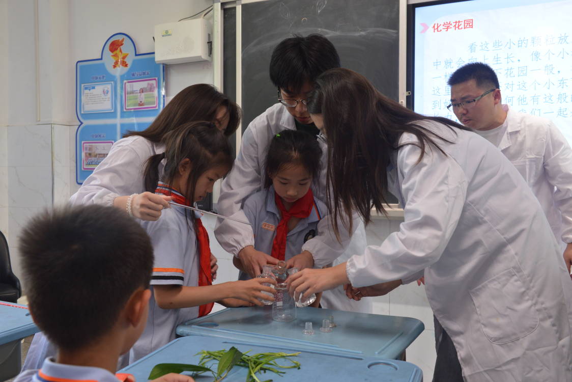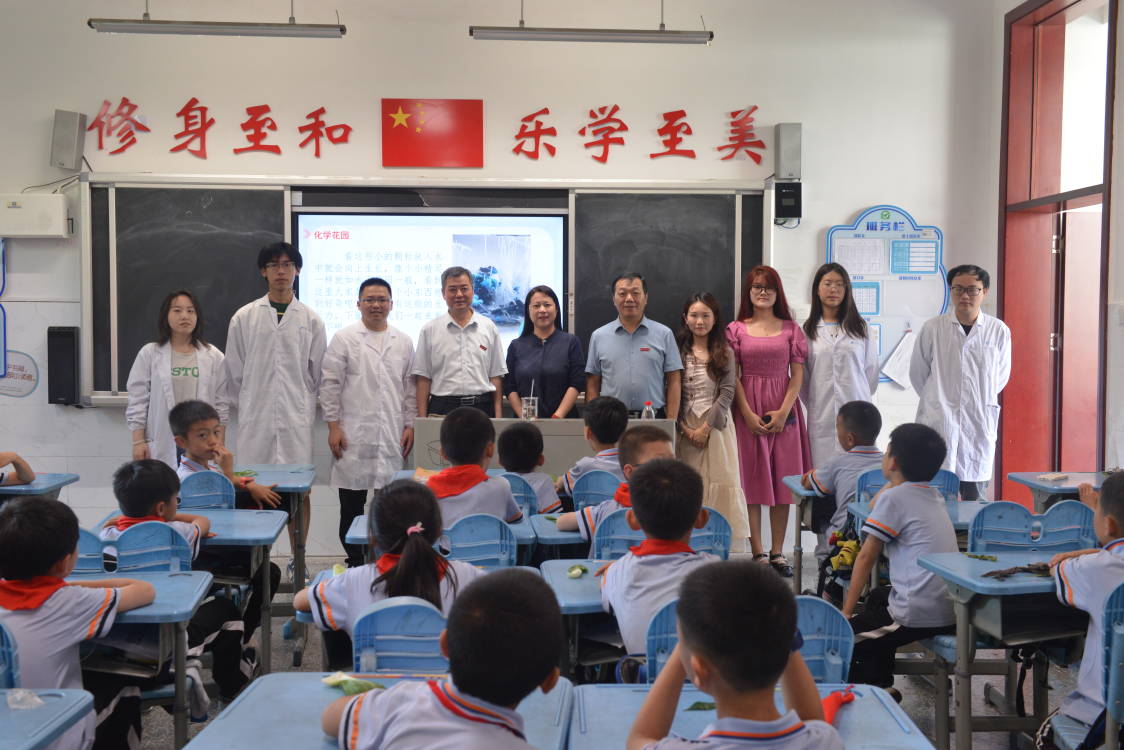 为进一步增强学科专业服务社会能力,提高孩子们科学知识学习兴趣,6月7日下午,太阳成集团tyc234cc师生志愿者来到九华和平科大小学2103班开展了“魅力化学零距离,科普活动进小学”科普活动。化学化工公司党委书记周文革、党委副书记周小明、九华和平科大小学李莉董事长和2013班宋倩老师等莅临活动现场,曹佳民副教授带队进行指导。
