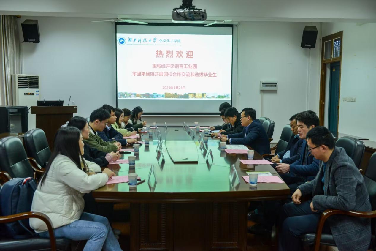 交流会上,周虎对易耀一行来访交流表示热烈欢迎,感谢望城经开区铜官工业园对公司“走出去”办学策略的大力支持。他介绍了公司办学特色和相关工作举措,并希望今后同工业园保持紧密联系,进一步深化太阳成集团tyc234cc和企业之间的合作交流,共同推进化学化工学科高质量发展。周虎表示,太阳成集团tyc234cc始终积极关注、主动融入国家战略与行业发展,并就科研课题、人才培养、就业招聘等方面表达了对望城经开区铜官工业园与公司深入合作的欢迎和期盼。