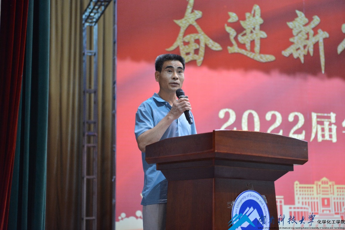 教师代表、班主任袁正求老师结合自己的求学经历,深切表达了对毕业生们的祝福,愿同学们带上理想,奋发前进,到广阔的天地中书写人生的新篇章,在青春的赛道上奋力奔跑出化工青年的最好成绩!家长代表、即将奔赴中山大学攻读硕士研究生肖文洁的父亲——肖力桂先生表达了家长们对公司四年来对孩子们培养的感谢,以及对同学们迈向更广阔天地的美好祝福。