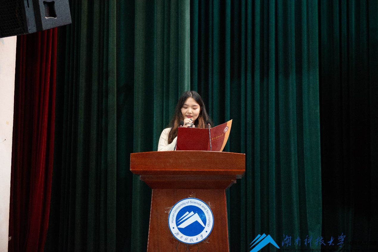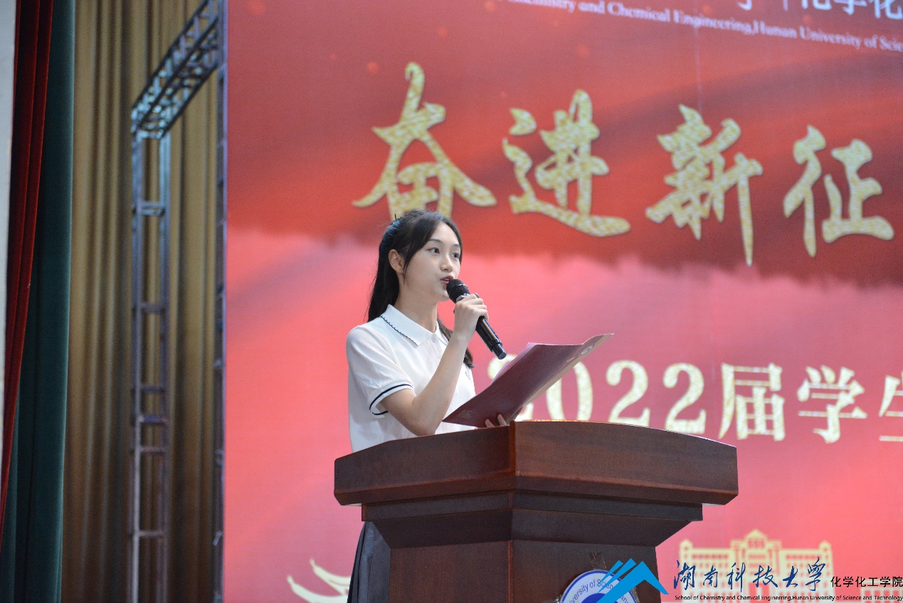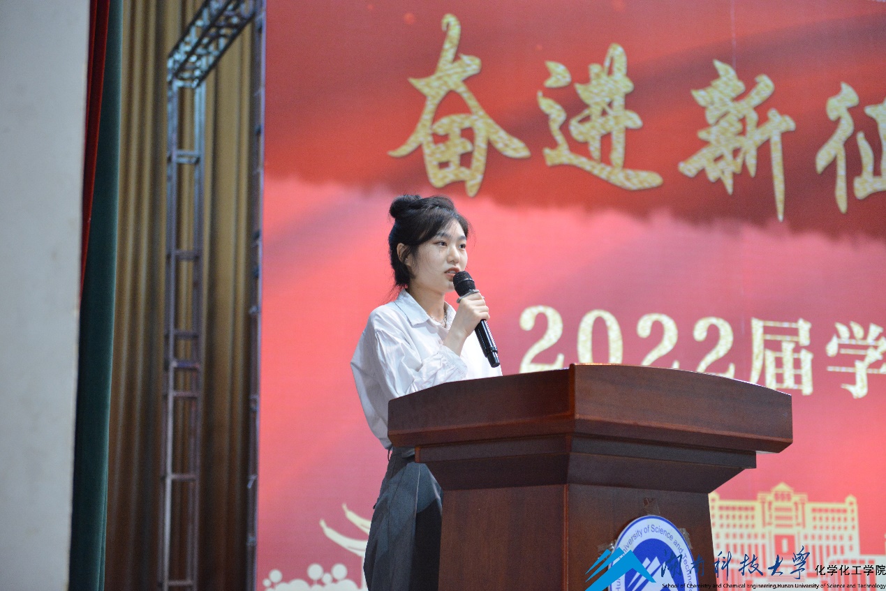 2019级化学工程与工艺专业唐泽溪同学代表全体非毕业生,向毕业生学长学姐表达了最真挚的祝福,并表达了“将紧随学长学姐步伐,努力学习,开拓进取,争取更大荣光”的坚强决心。