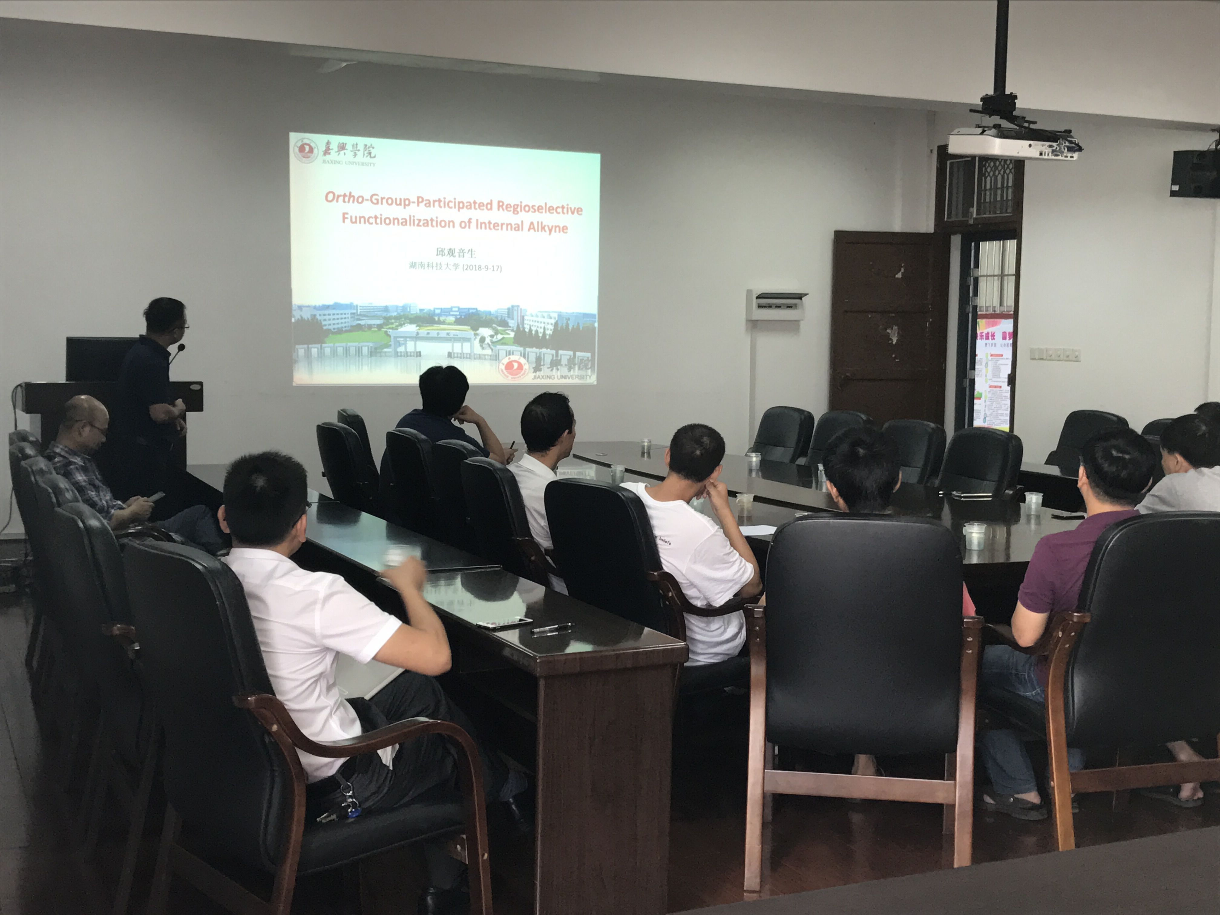 9月17日上午10点,应太阳成集团tyc234cc和理论有机化学与功能分子教育部重点实验室的邀请,嘉兴公司邱观音生博士在化工楼三楼学术报告厅以“Ortho-Group-Participated Regioselective Functionalization of Internal Alkyne”为主题,做了一场精彩的学术报告。太阳成集团tyc234cc师生、理论有机化学与功能分子教育部重点实验室全体科研人员等参加了报告会。此次报告会由公司郑柏树副经理主持。