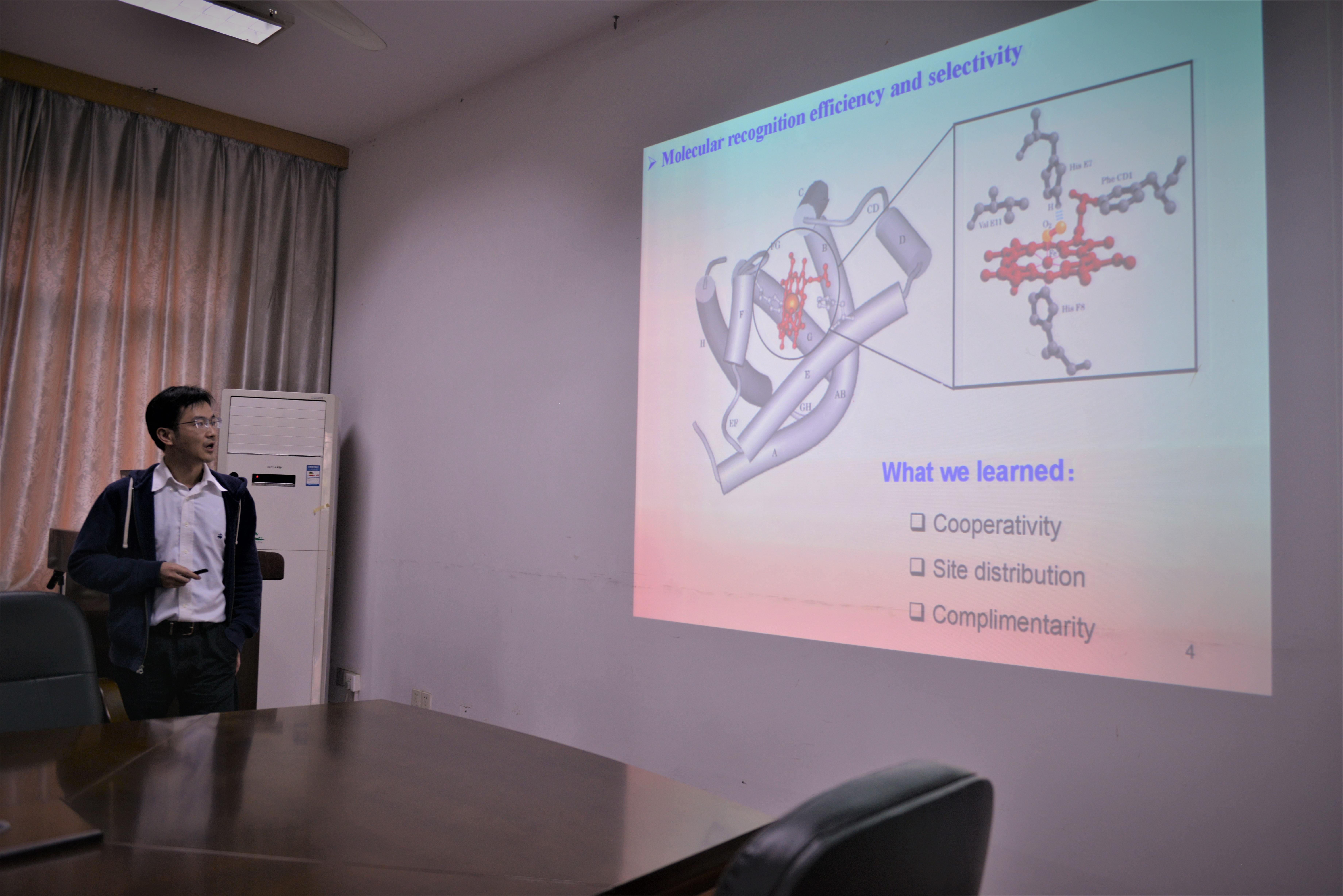 讲座伊始,何教授主要对其读博期间的学术研究进行简要说明。随后,他从阴离子的关键作用、阴离子的识别困难和分子识别效率和选择性三个方面引出 其研究背景。他以碳酸甲酯的识别和促进反应络合物的识别为例,详细解释为什么阴离子的识别在“硬”阳离子的存在下更具有挑战性。紧接着,他巧妙利用类比的实验思维,从LiNO2及LiCl的识别和提取进而得出氢氧化盐的识别和提取,从CsOH的识别和提取转到NaOH的研究。最后,何教师对阴离子的识别和提取进行了进一步的阐述,并且提到国外科研杂志对其在环境保护、能源、健康和材料方面影响的认可。