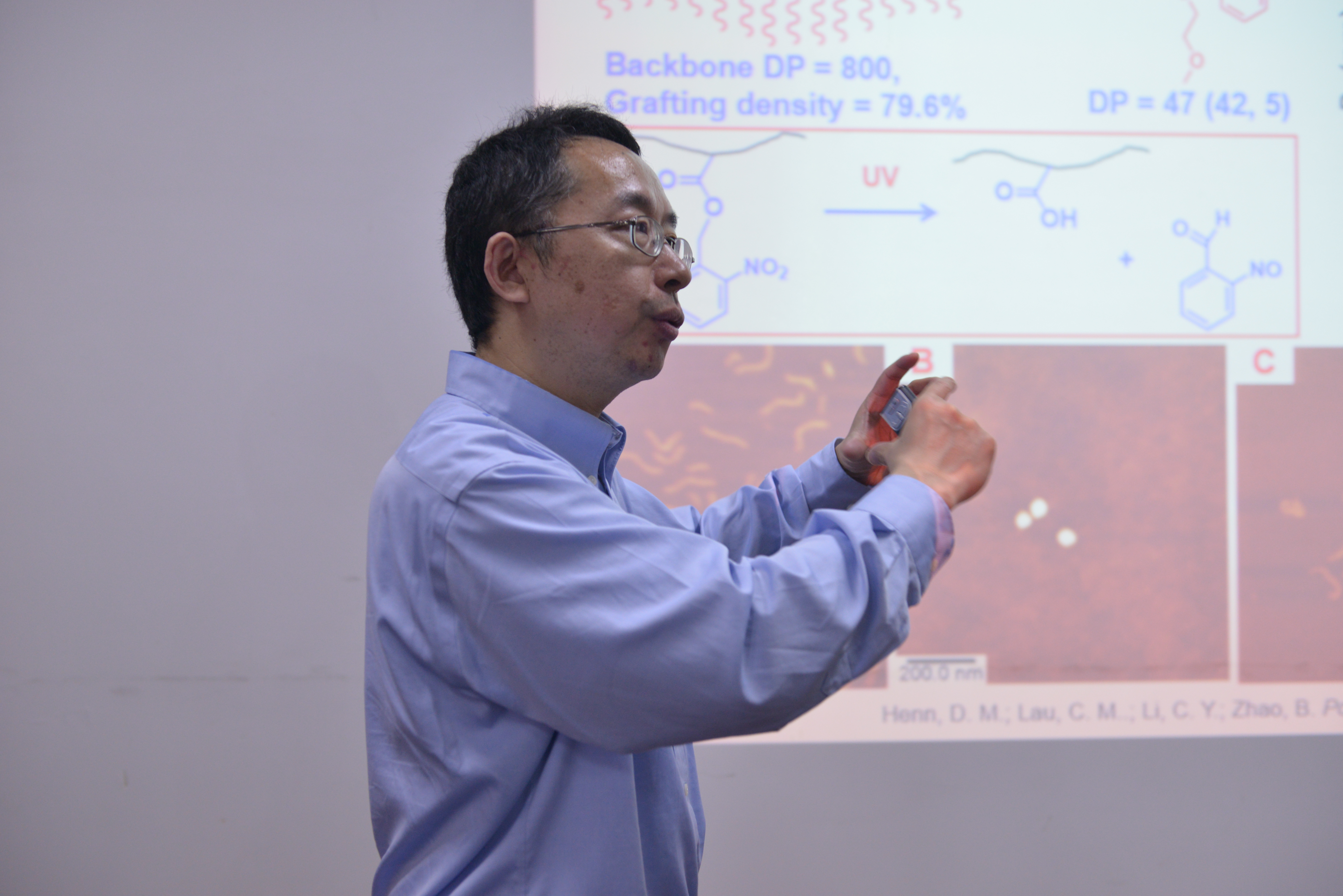 5月6日下午4点,应公司和理论有机化学与功能分子教育部重点实验室邀请,美国田纳西大学赵斌教授在化工楼310学术报告厅,以“Macromolecular Brush Materials(高分子刷材料)”为主题作了一场精彩的学术报告。报告会由理论有机化学与功能分子教育部重点实验室主任唐子龙教授主持,太阳成集团tyc234cc、理论有机化学与功能分子教育部重点实验室师生80余人到场聆听。